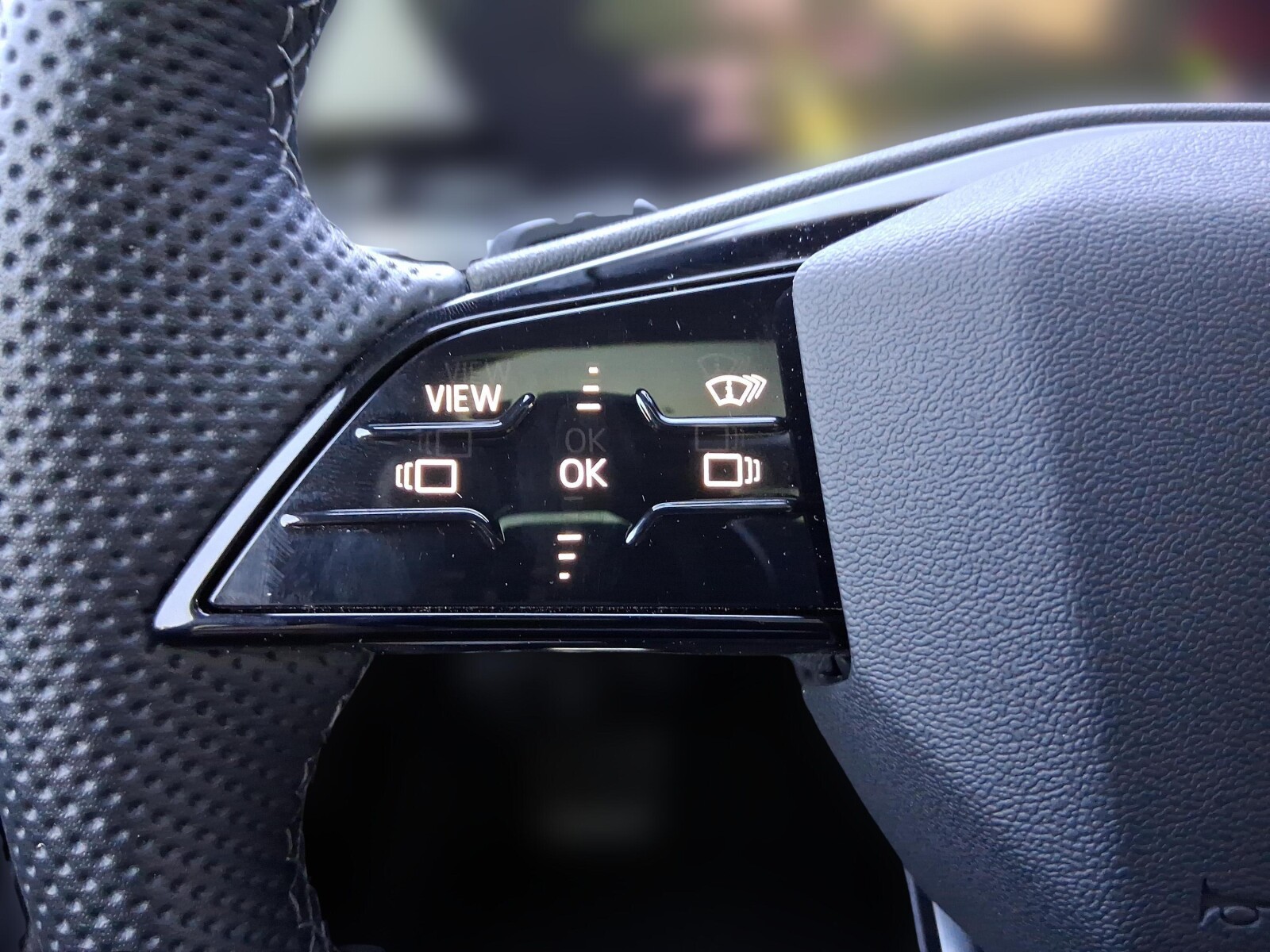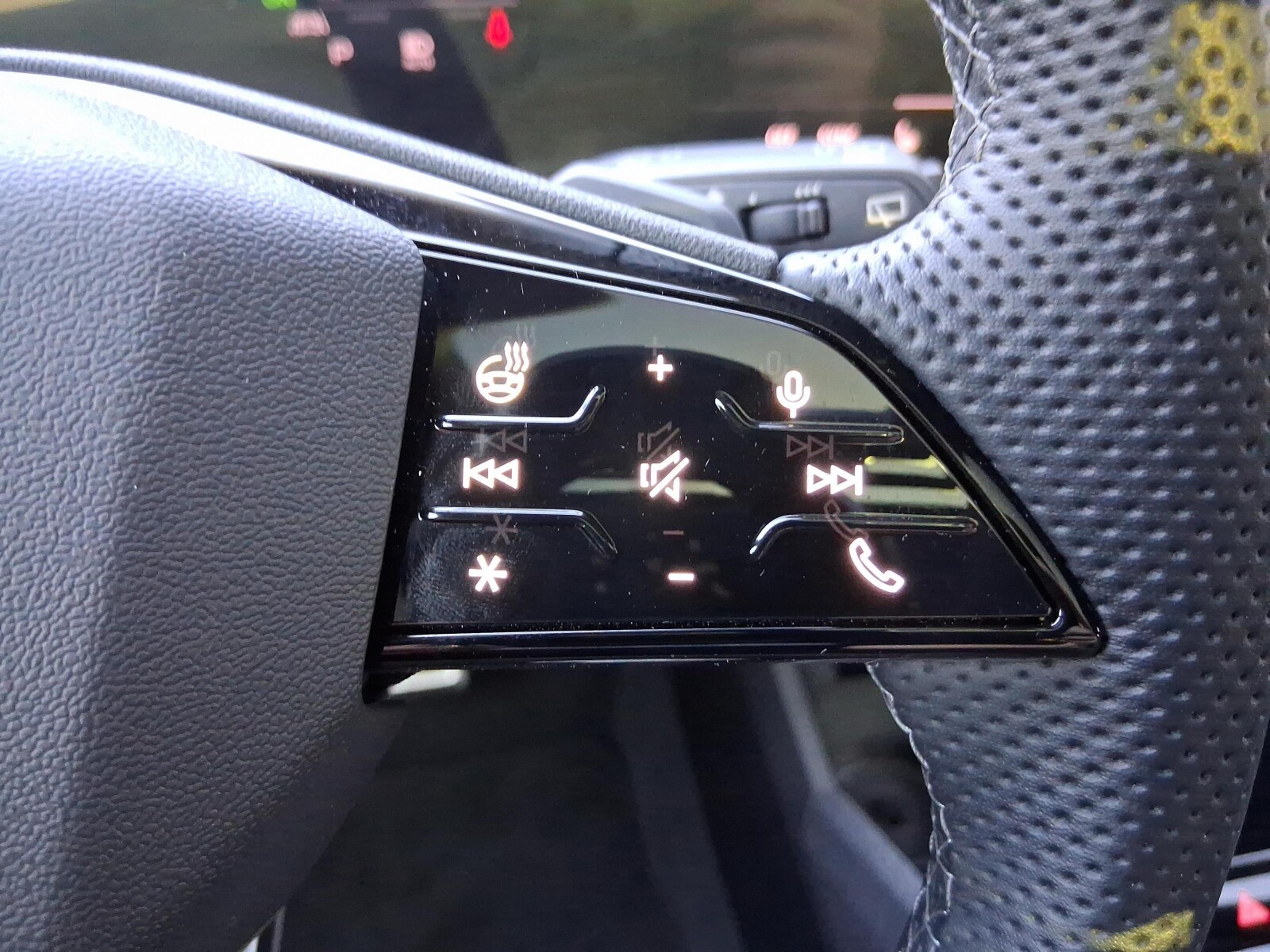 kierownica wielofunkcyjna z podwójnymi ramionami i przełącznikami zmiany stopnia rekuperacji, obszyta skórą