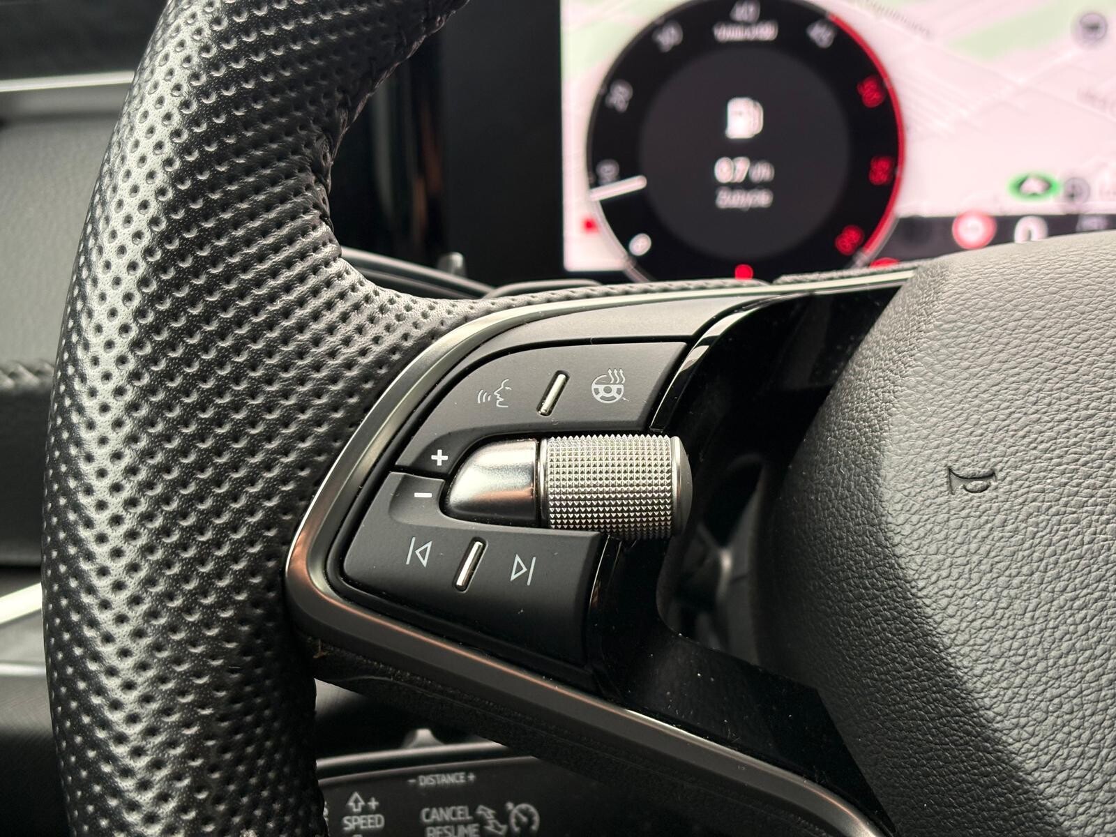 - Kierownica sportowa 3-ramienna, skórzana, wielofunkcyjna podgrzewana z manetkami, czarne obszycie