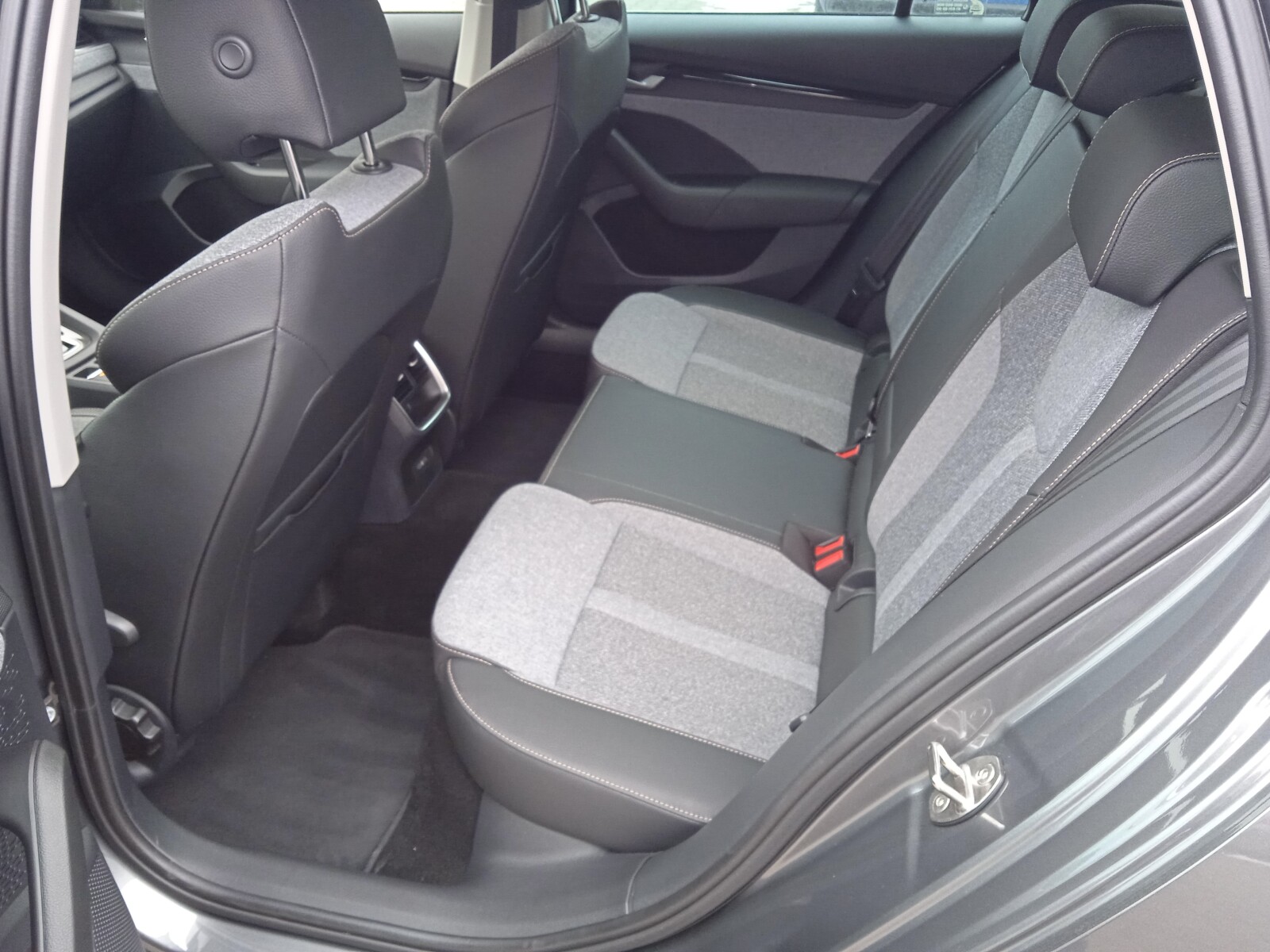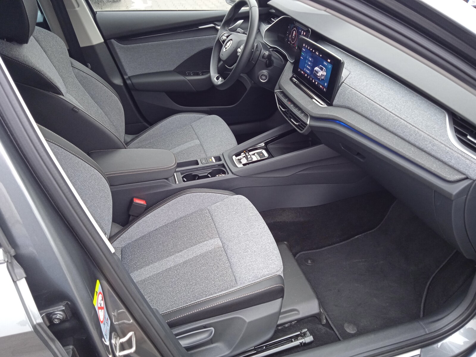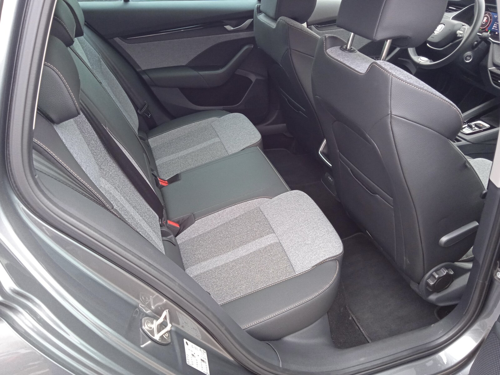 - Wnętrze Design Selection Lodge (Podsufitka w kolorze szarym, Oparcie tylnej kanapy składane od strony bagażnika poprzez przycisk, Oświetlenie Ambiente, Tapicerka na drzwiach szara tkanina z recyklingu w połączeniu ze sztuczną skórą w kolorze czarnym, Dekor drzwi - Piano Black, Design Selection deski rozdzielczej - tkanina z recyklingu szara, 2 rzędy przeszyć w kol. Mochccino, Dekor deski rozdzielczej - Mutant Cocoon Silver, Tapicerka z tkaniny z recyklingu w kolorze szarym/ w połączeniu ze sztuczną skórą w kolorze czarnym)