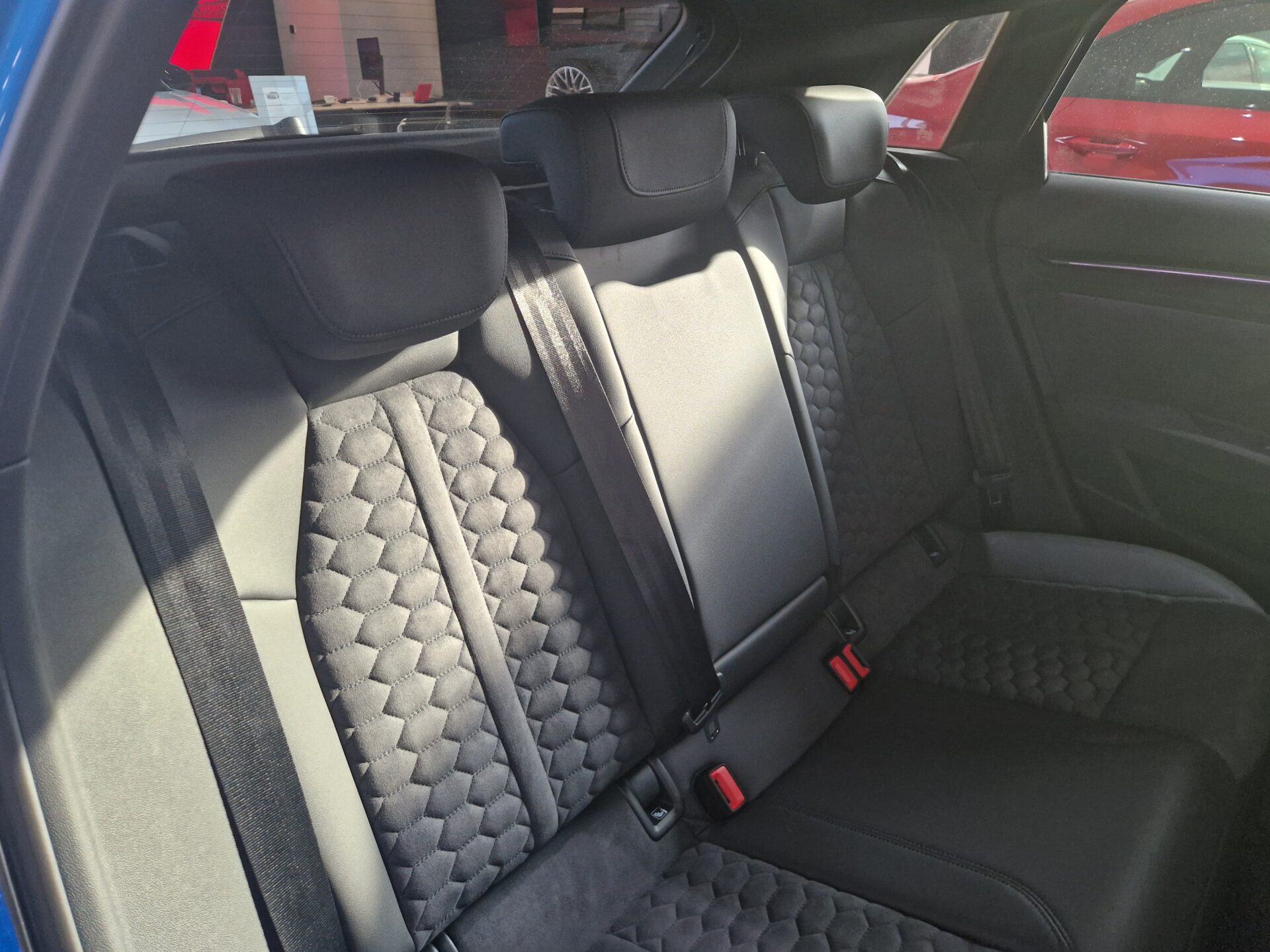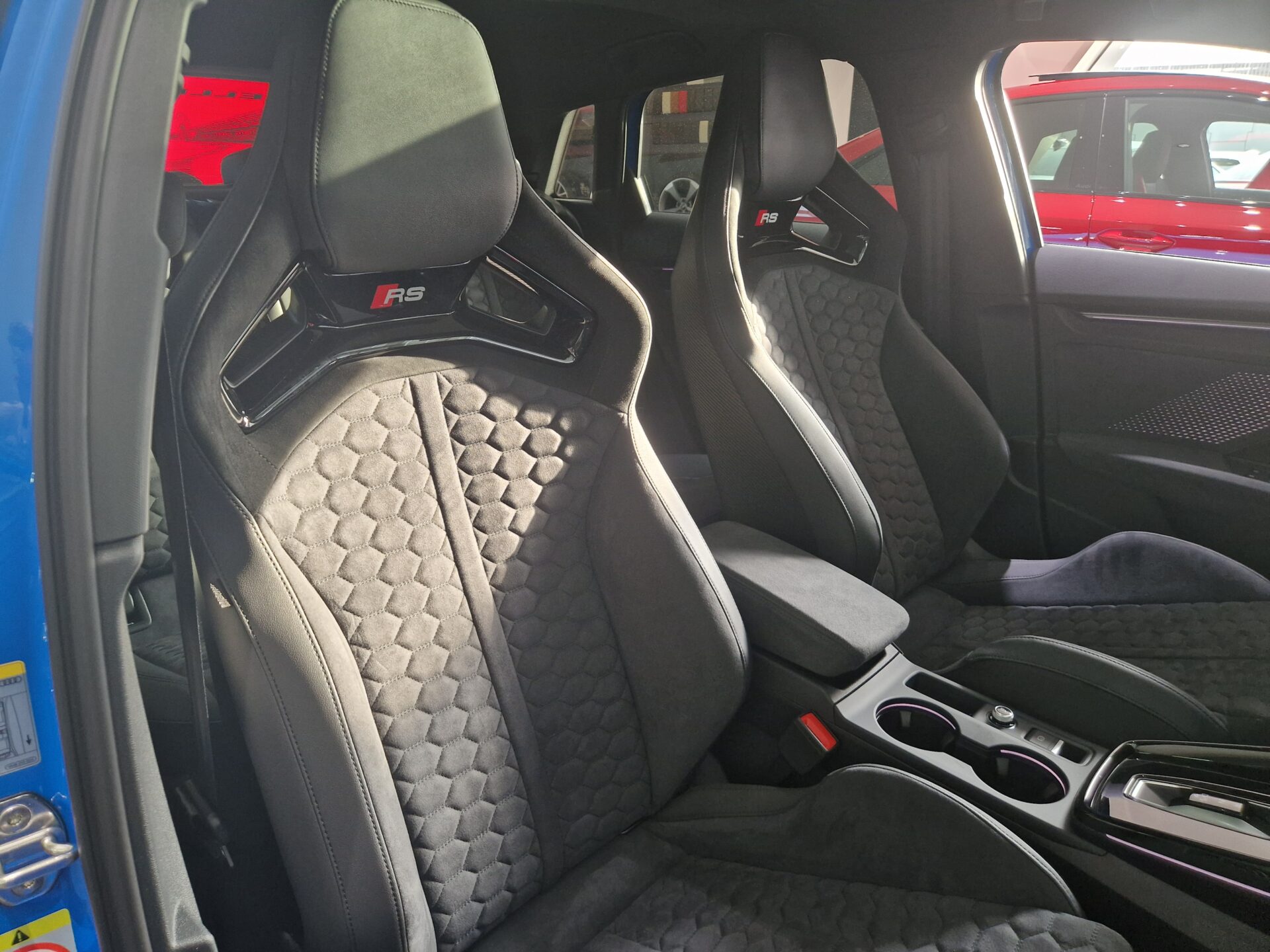 Kombinacja mikrofibra Dinamica/skóra z pikowaniem w sześciokąty i logo RS na oparciach przednich siedzeń
