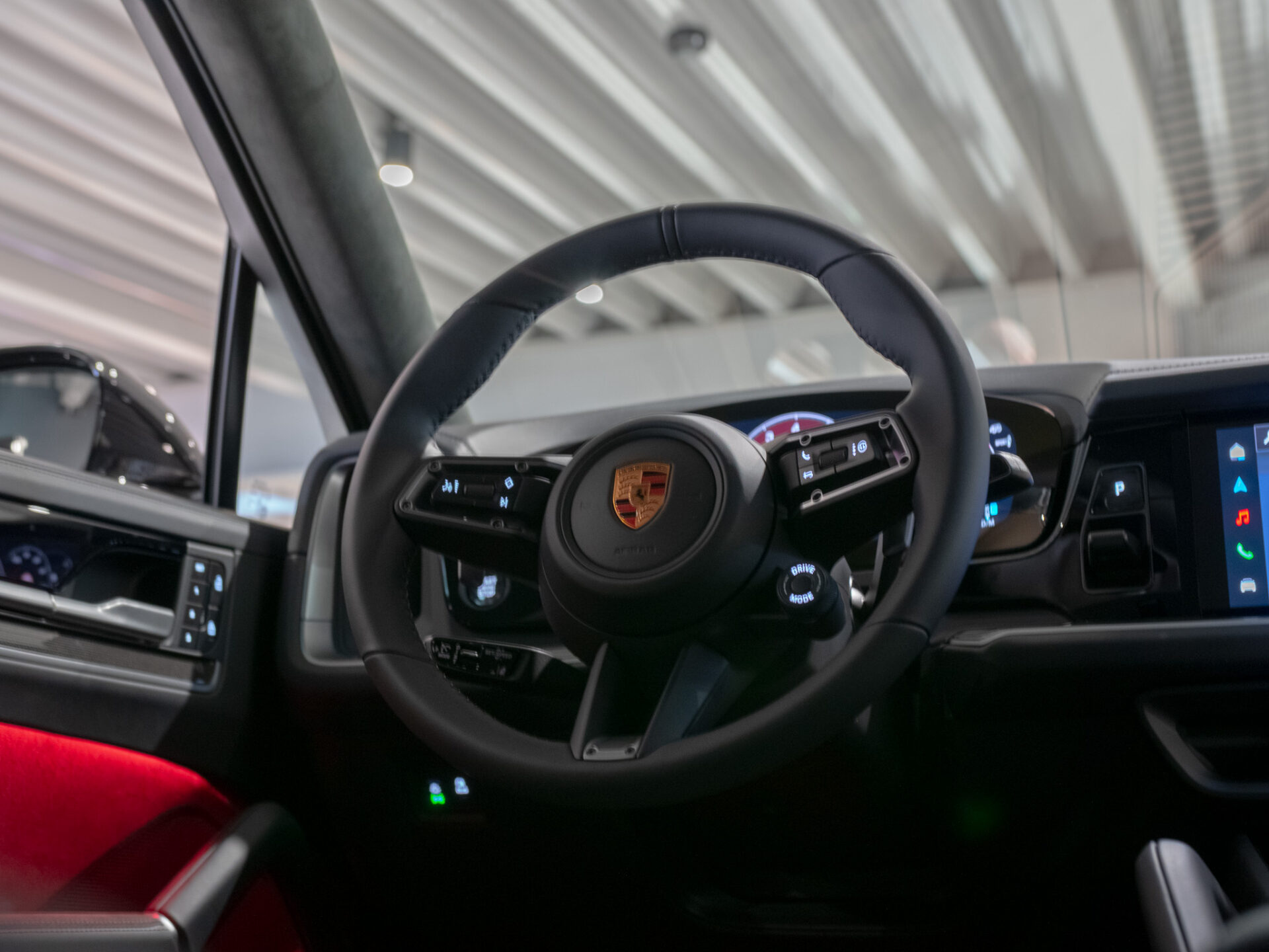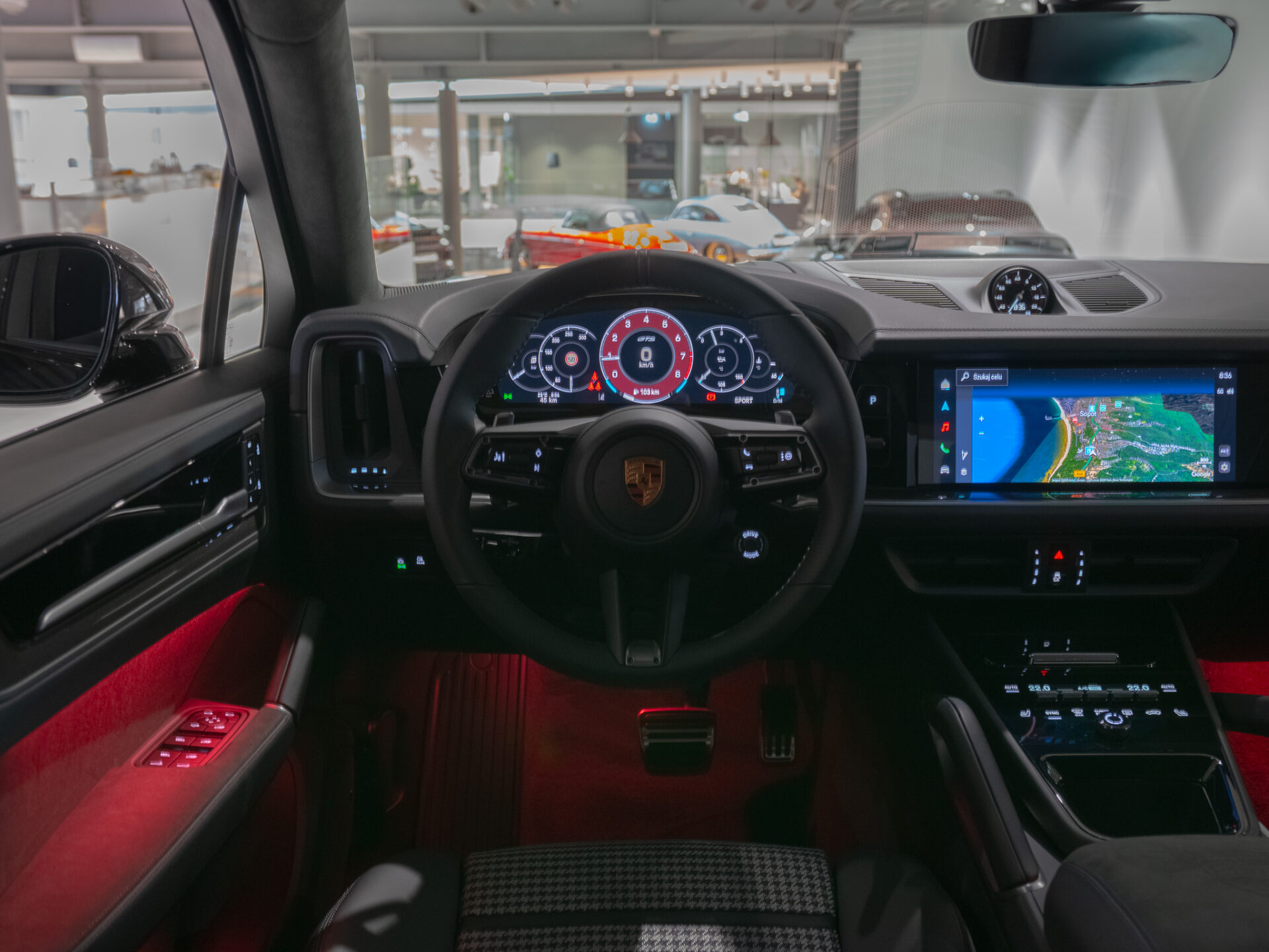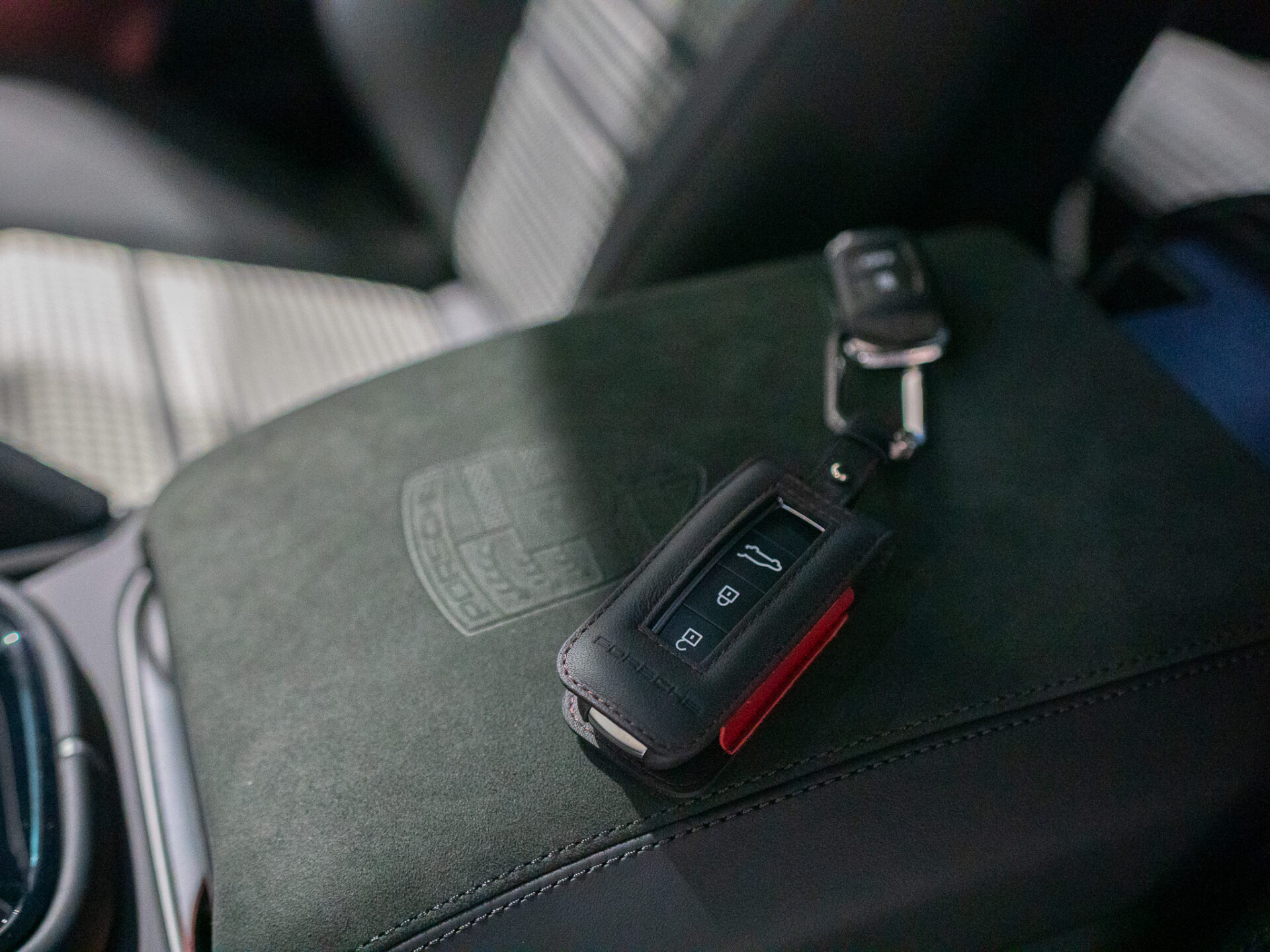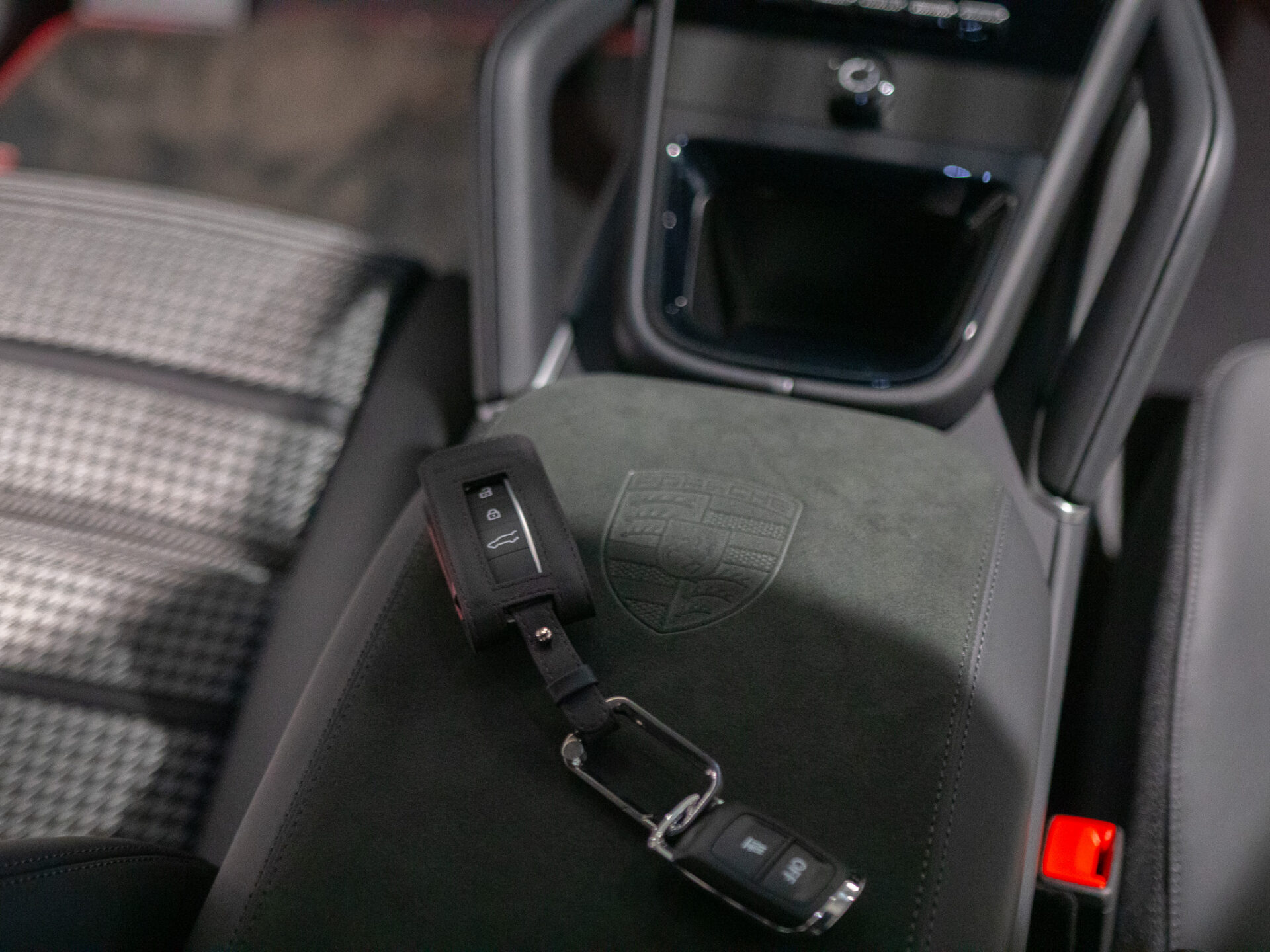 6E2 Herb Porsche wytłoczony na podłokietniku w konsoli środkowej