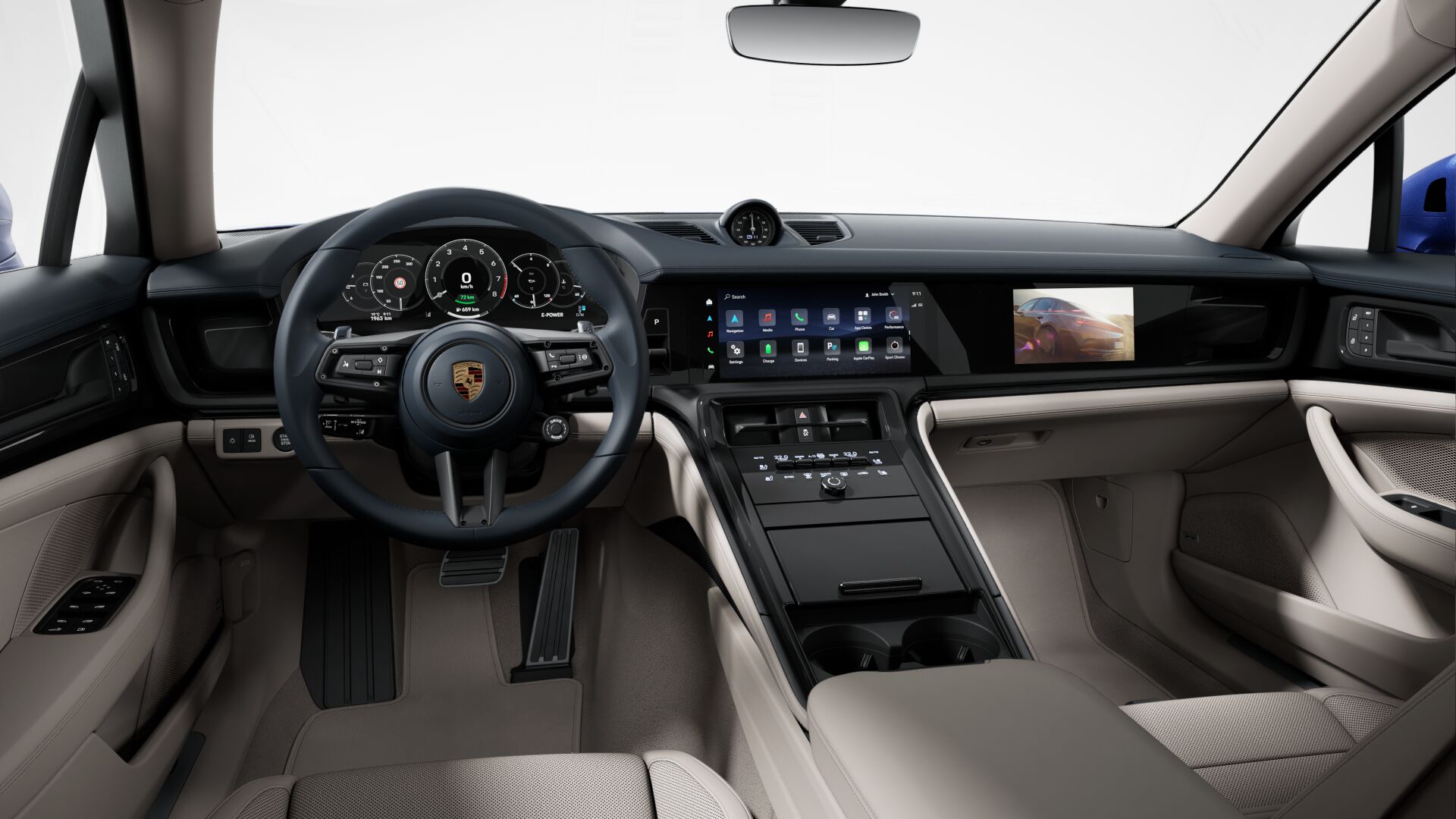 Wnętrze wykończone gładką skórą w dwóch kolorach: Dark Night Blue i Chalk Beige