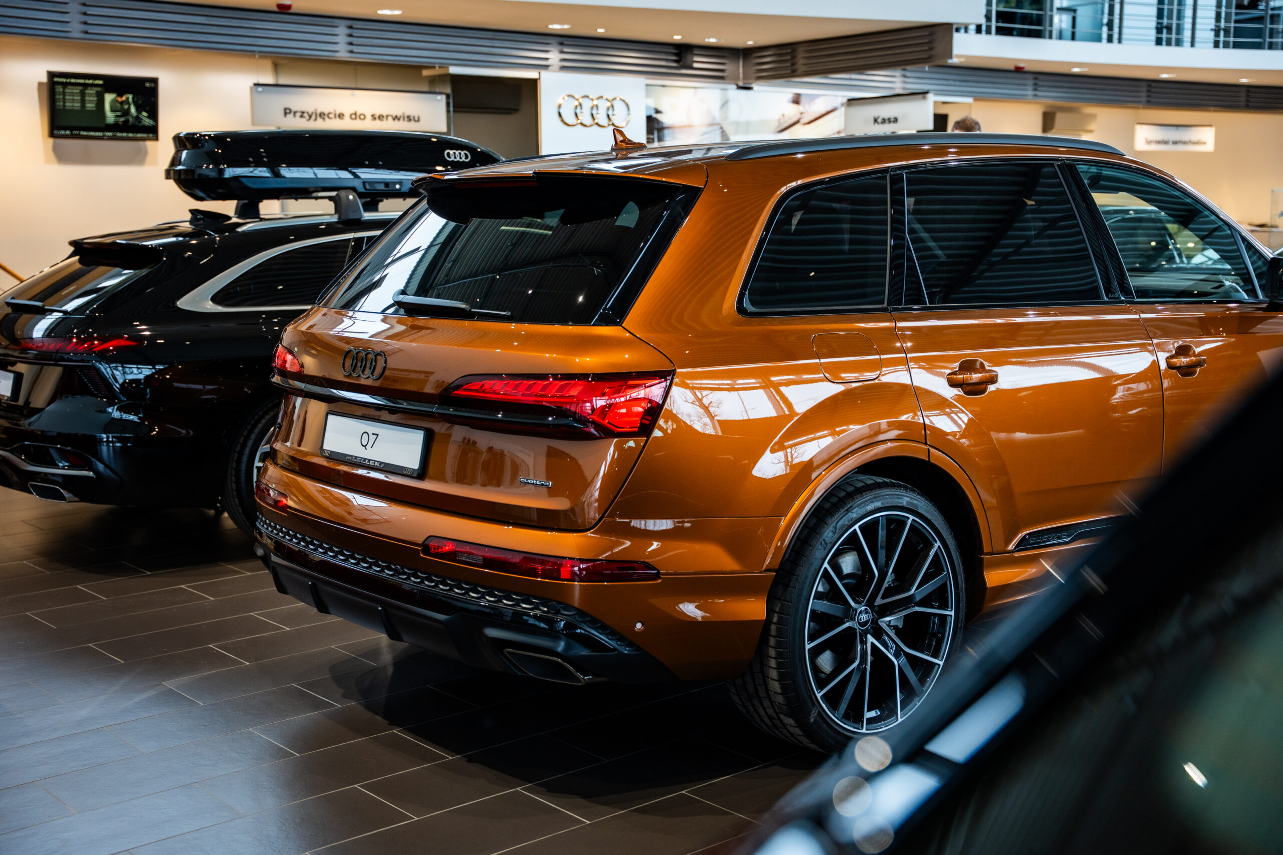 - Brązowy Ipanema Brown – wyrafinowany brąz z metalicznymi drobinami, który wygląda prestiżowo, tak jak Audi Q7 widoczne na zdjęciach.